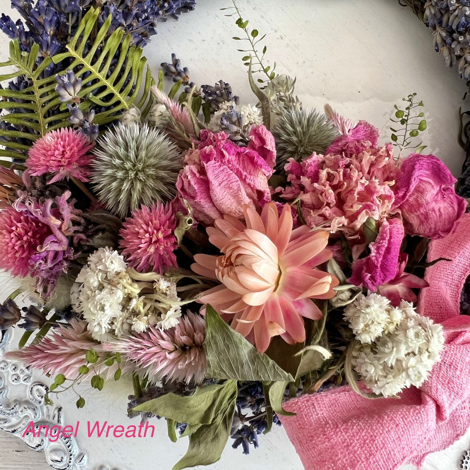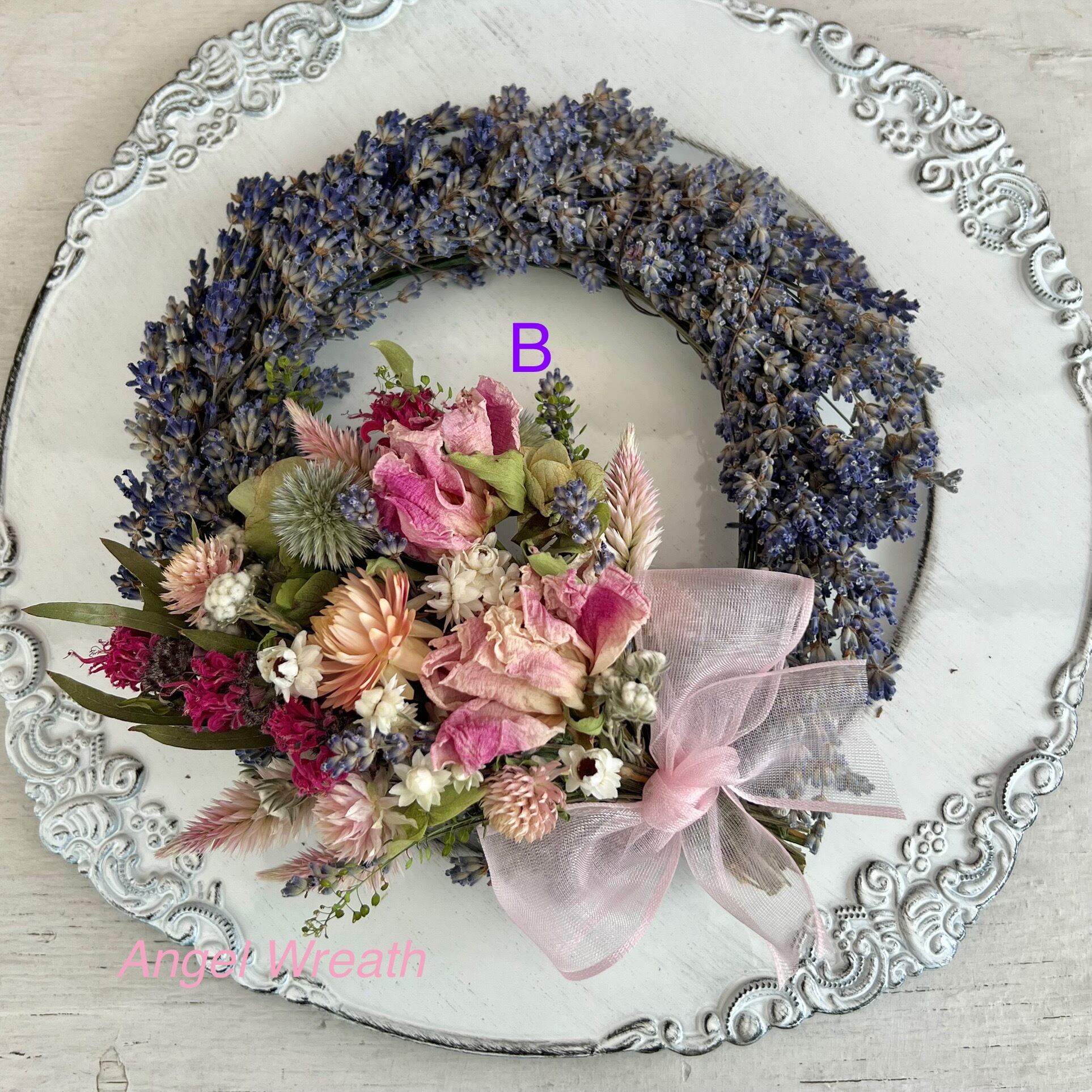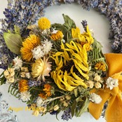 フレッシュのラベンダーを刈り取ってすぐにリースの形にして、ドライアップしたリースに香りの良いシャクヤクをメインに小花を組み合わせたミニブーケをあしらいました。