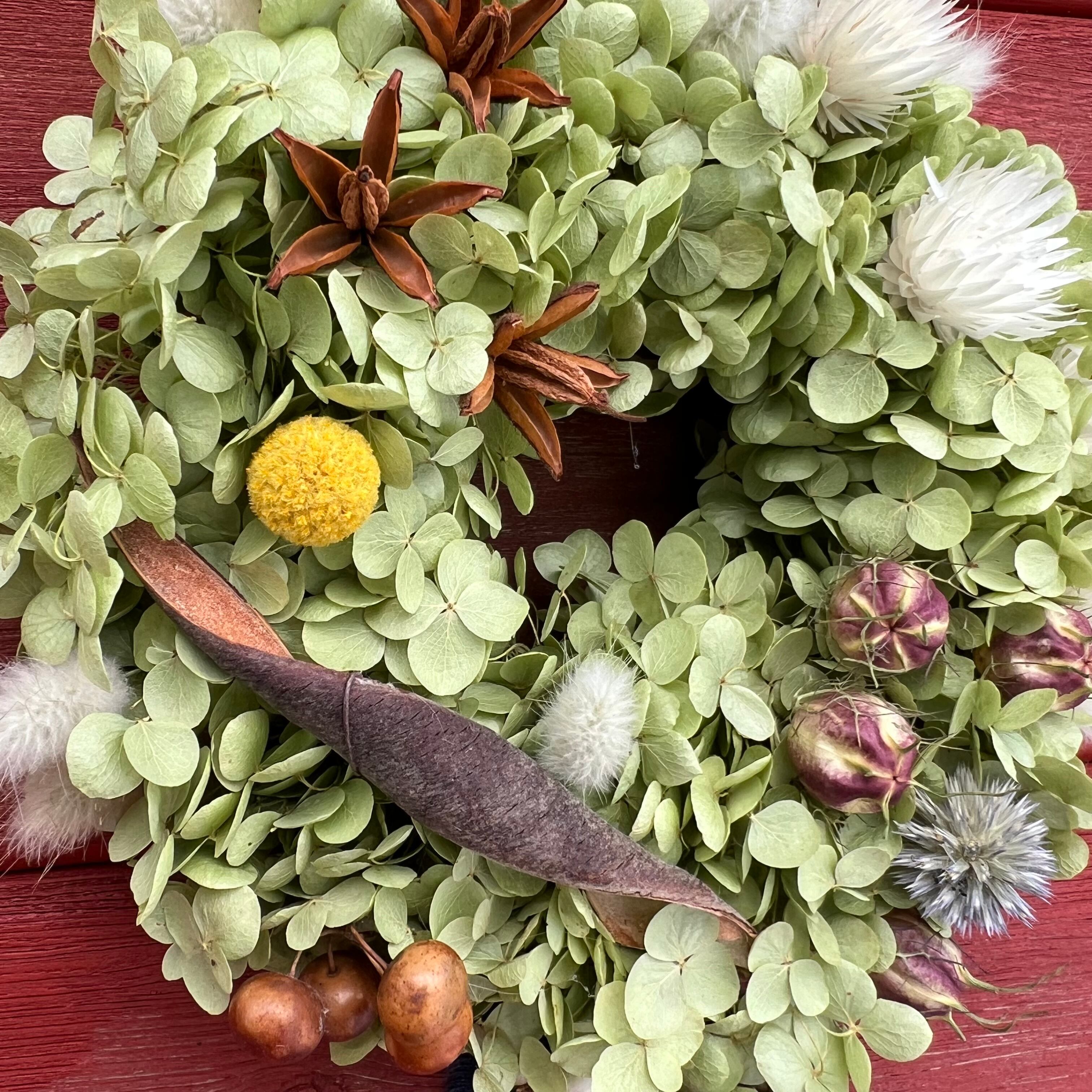 他に使っているドライフラワーは、シンカルファ、グロボーサ、ツツジの朔果,ルリタマアザミ、ラグラス・バニーテール、豆の殻