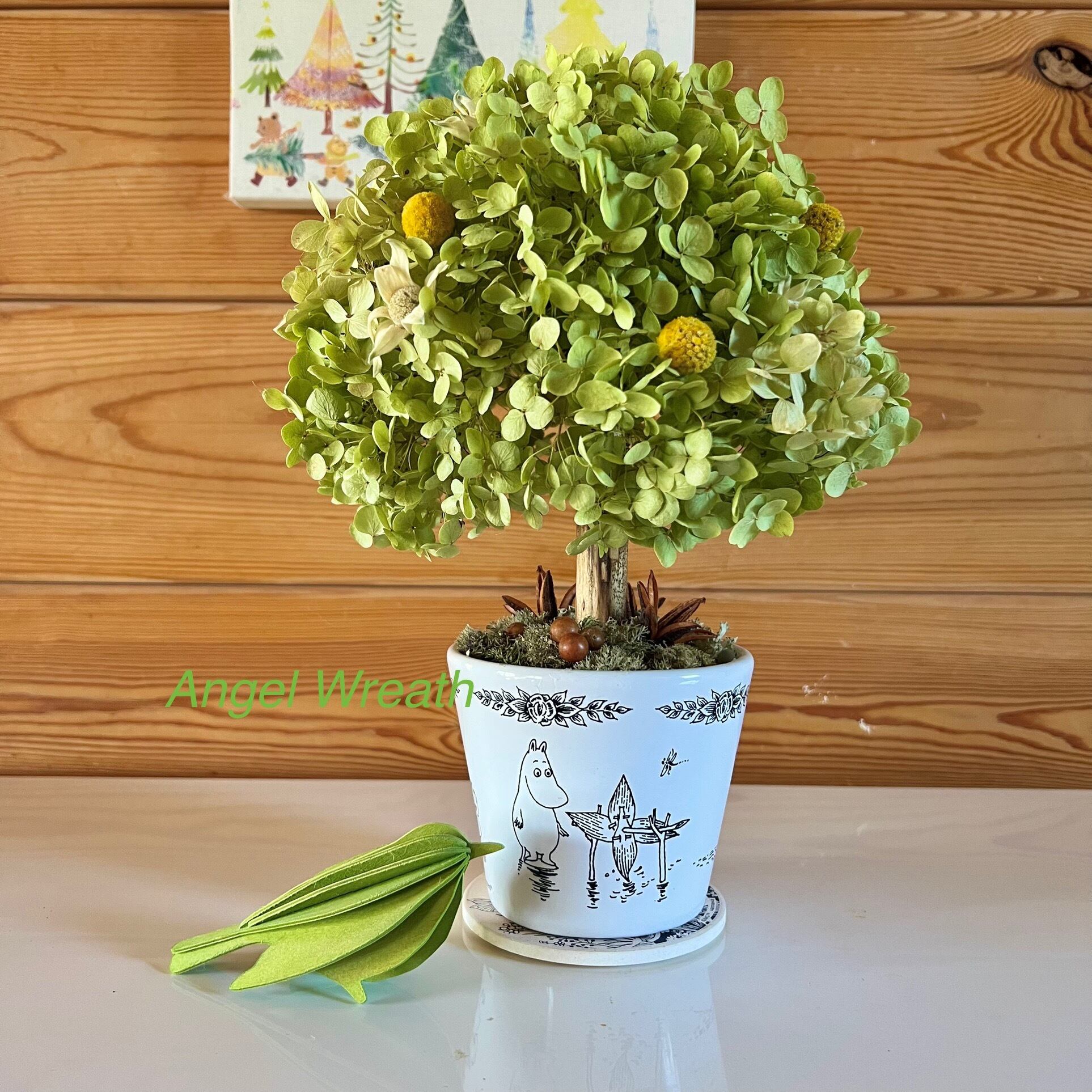 グリーンアナベルの一房がアフリカで見るような大樹みたいというひらめきからスタートして手持ちのムーミンカップに合わせたら大きさもイメージもぴったり。