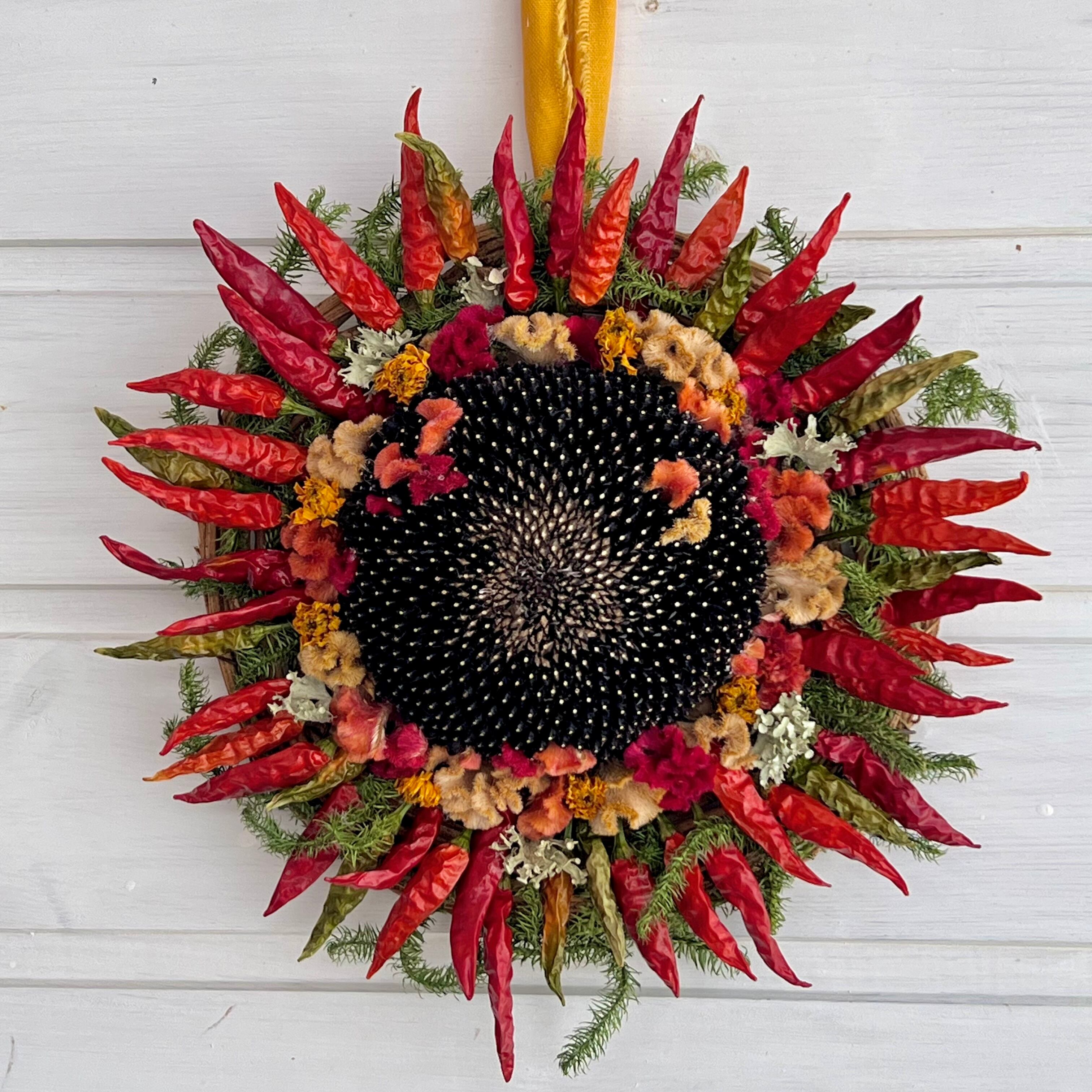 3色の久留米ケイトウやオレンジ色の姫ひまわりも添えて