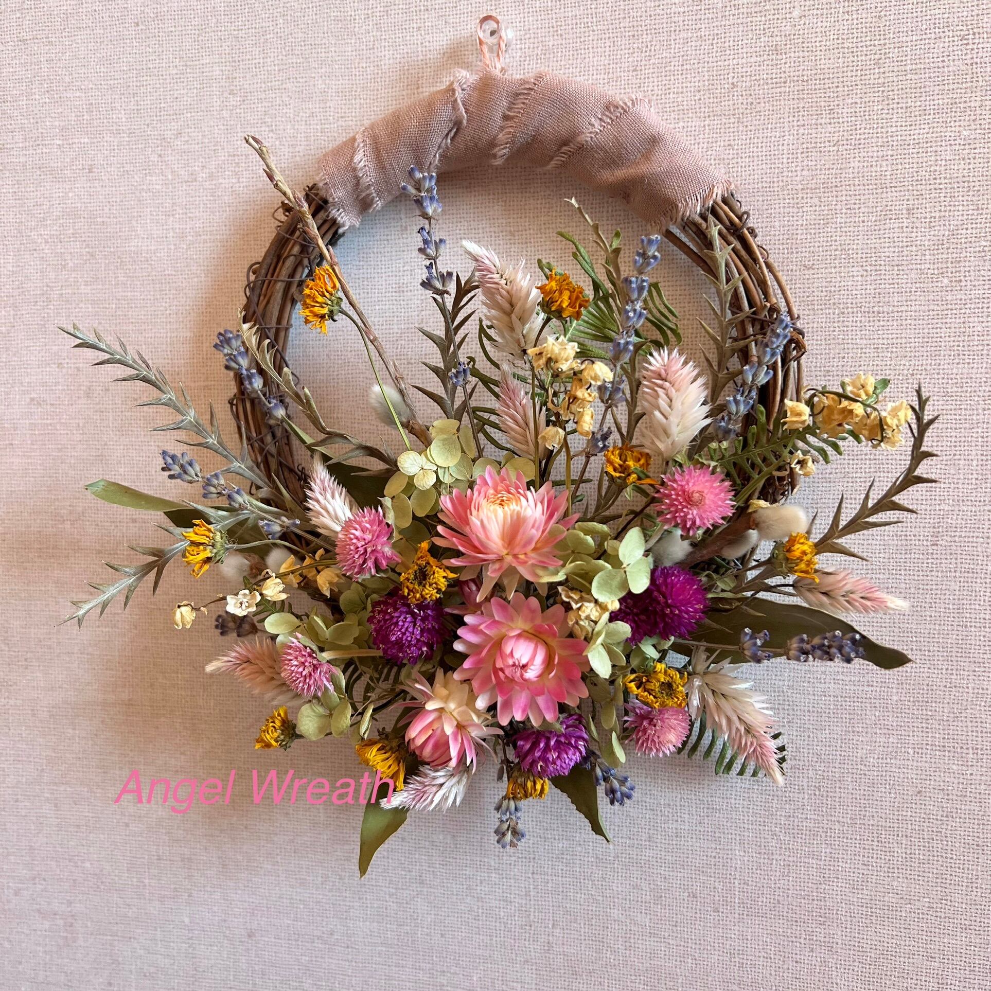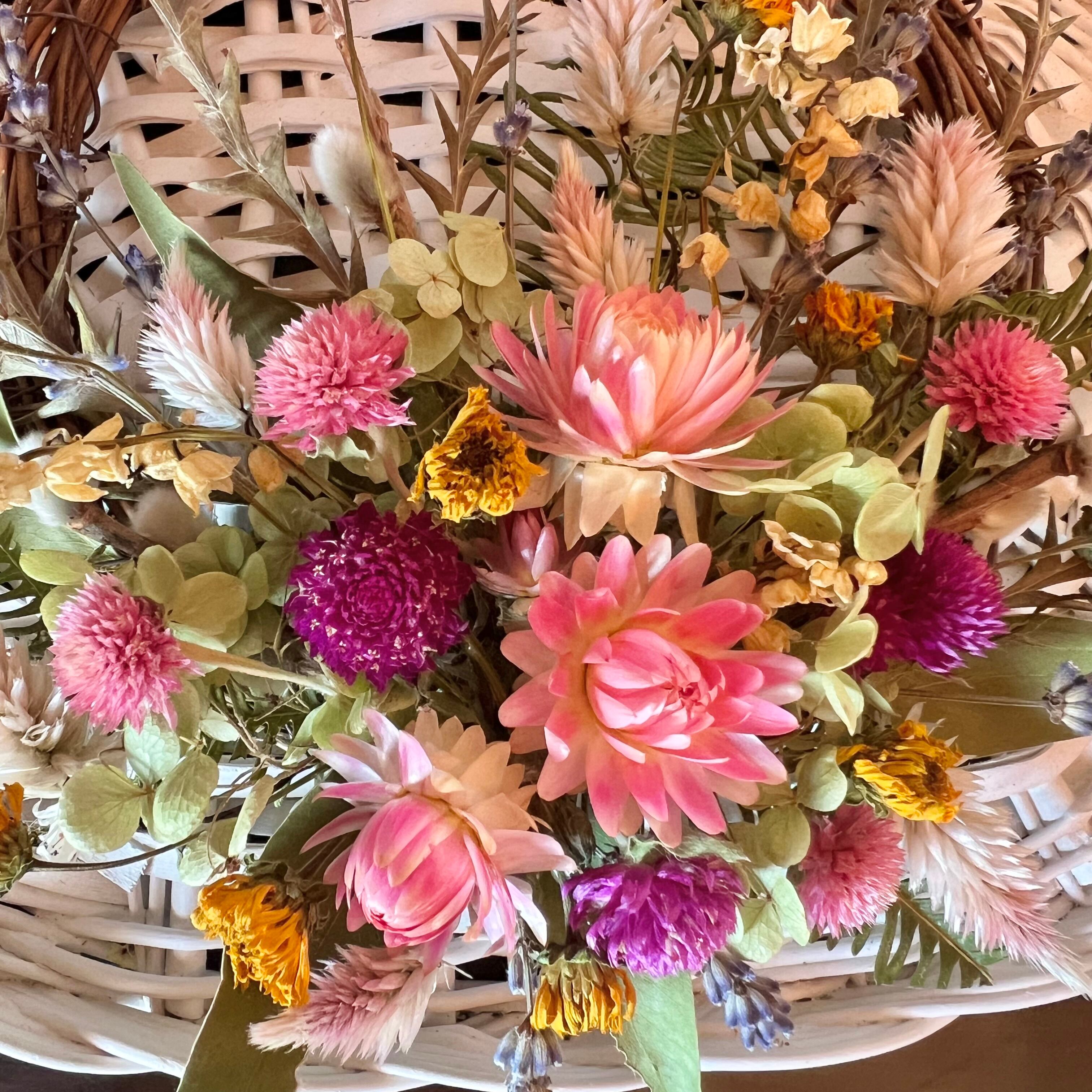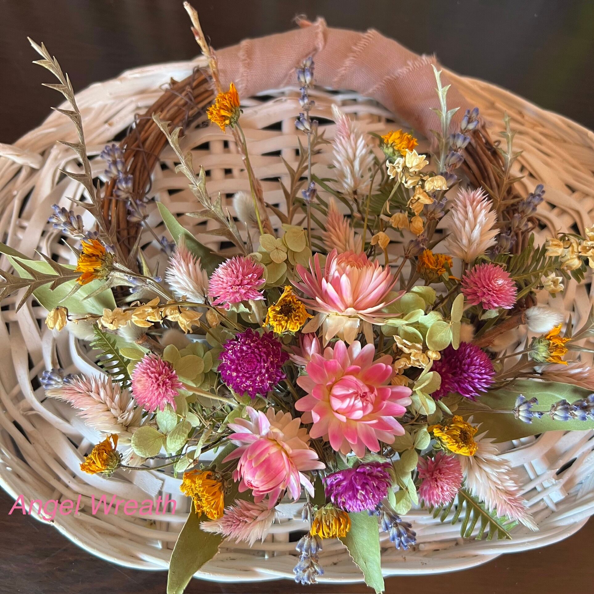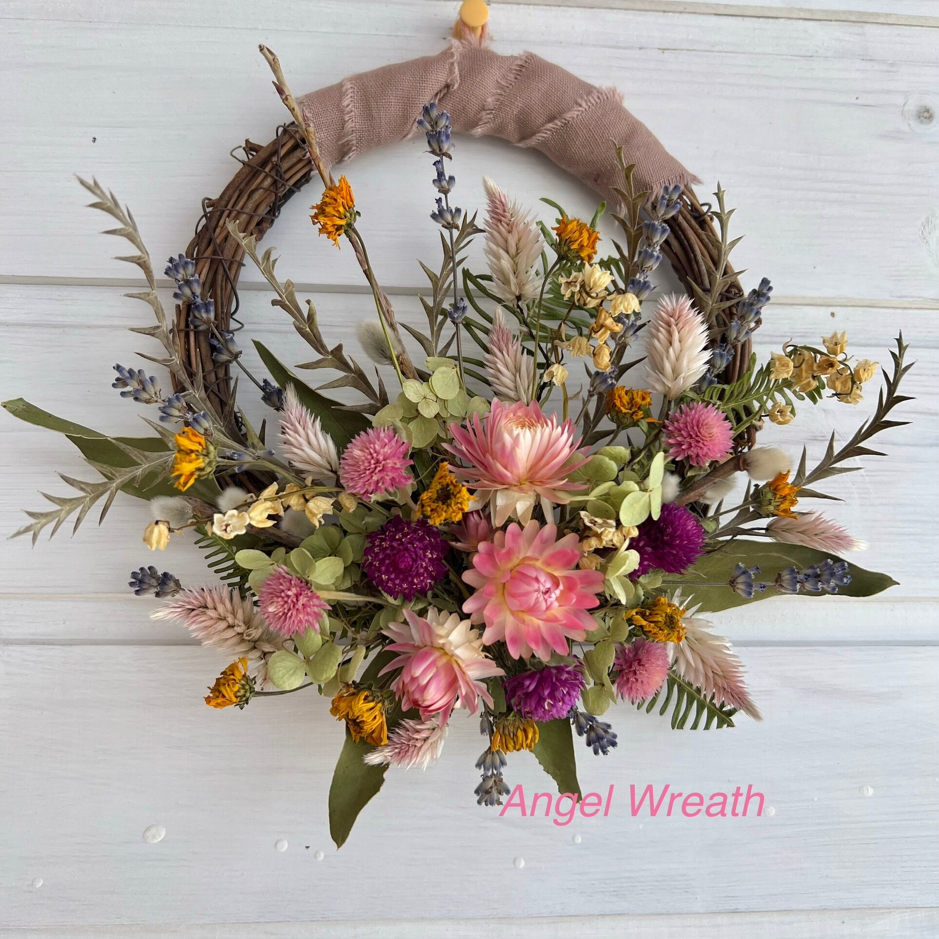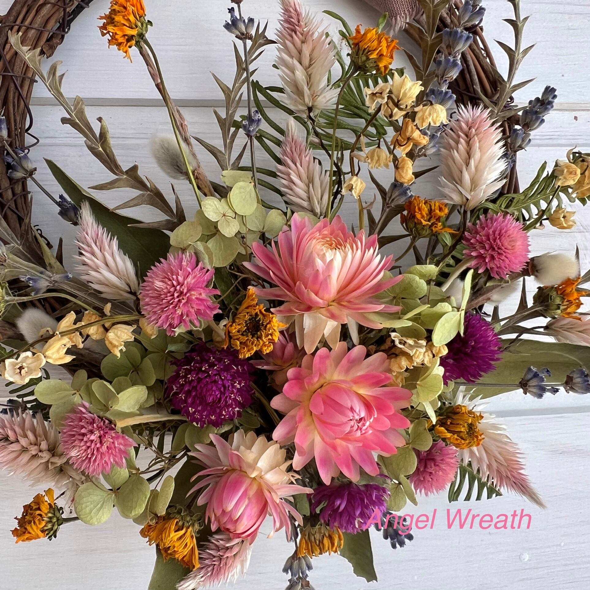使っているドライフラワーは、ヘリクリサム、センニチコウ、シャロンケイトウ、ヒメヒマワリ、ラベンダー、スズラン、アナベル、ユーカリ、グレビリア・アイバンフォーなど。