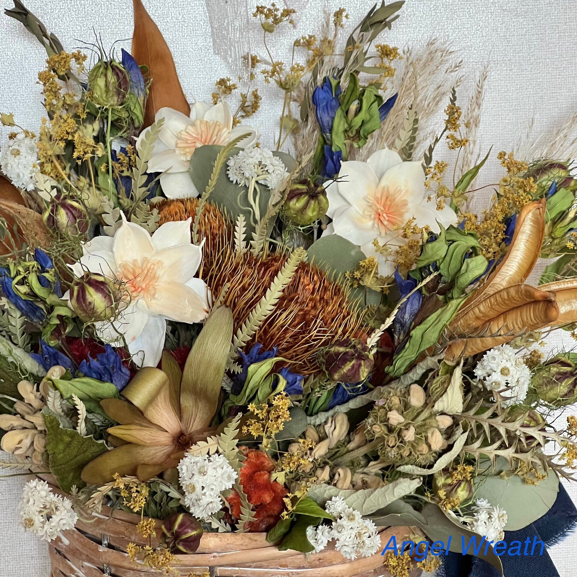 ドライアンドラ、エゾリンドウ、久留米ケイトウ、ハンドメイドフラワー、リューカデンドロン、ニゲラ、アルケミラ、ヤマハハコ、ラージエルサレムセージ、グレビリアアイバンホー、グレビリアゴールド、ツノゴマ、パンパスグラスなど