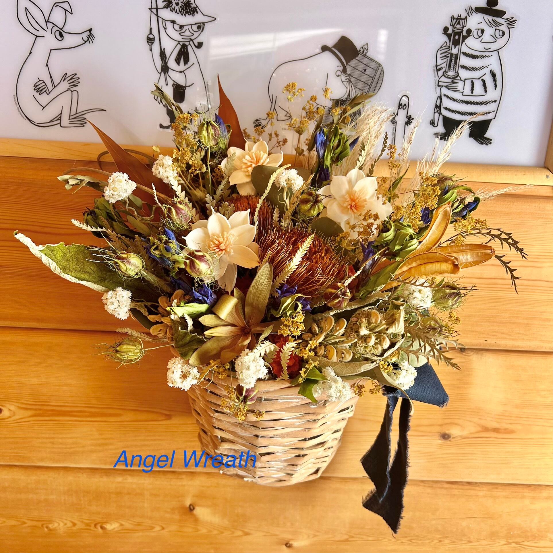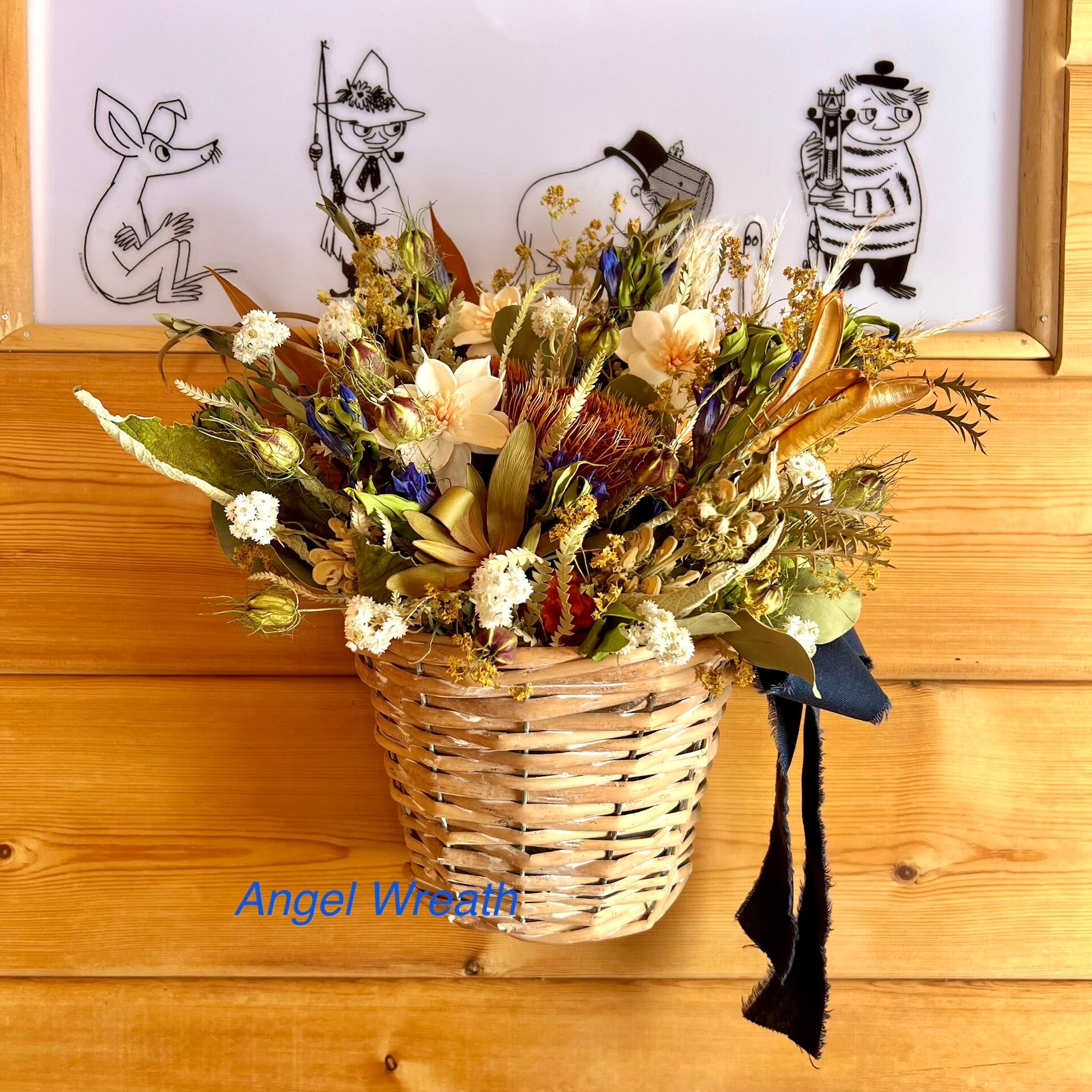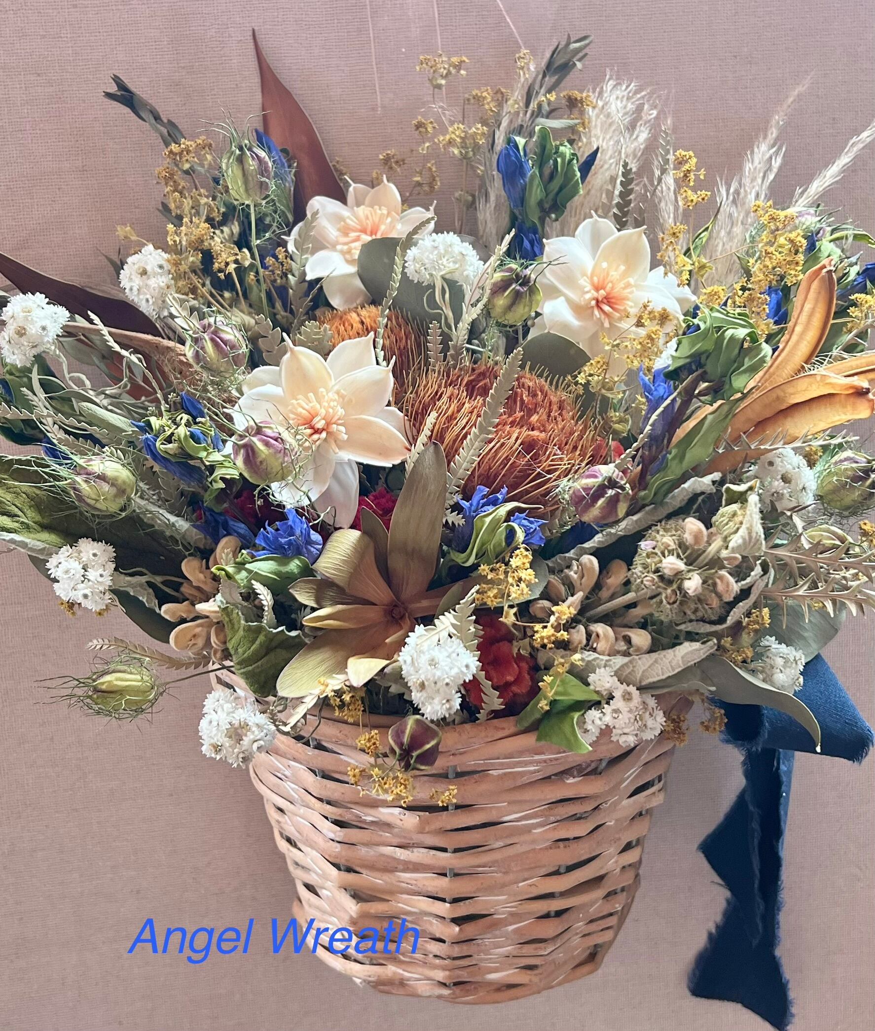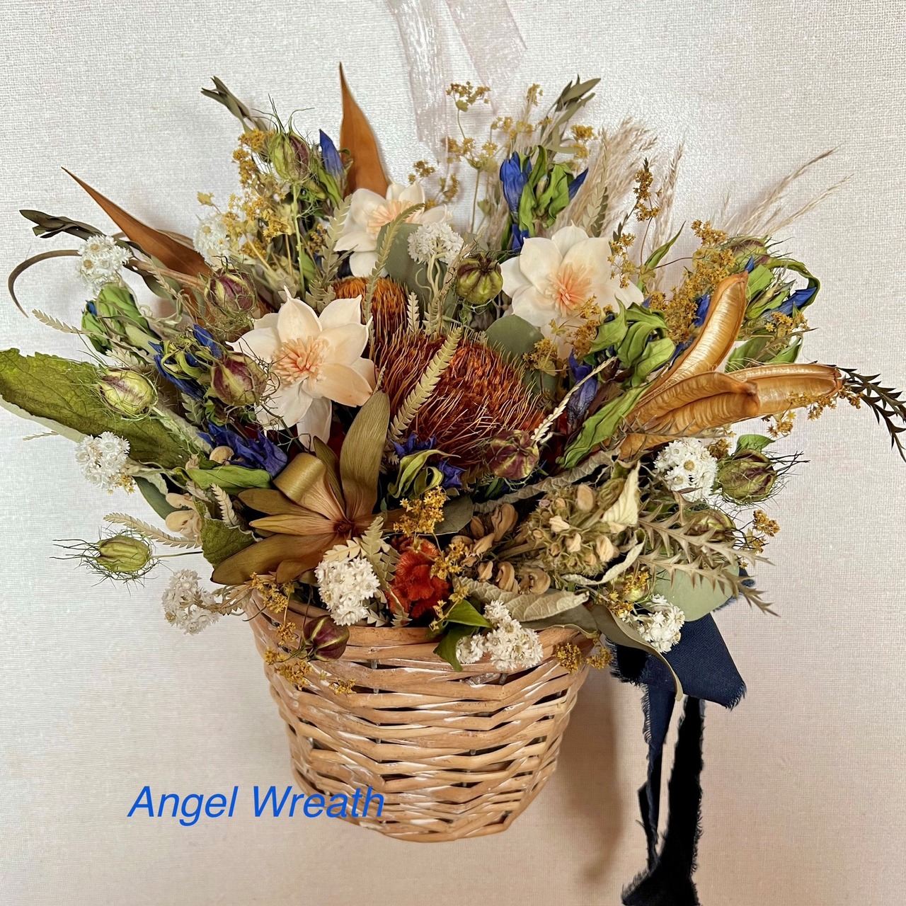 ドライアンドラとエゾリンドウの壁かけバスケット