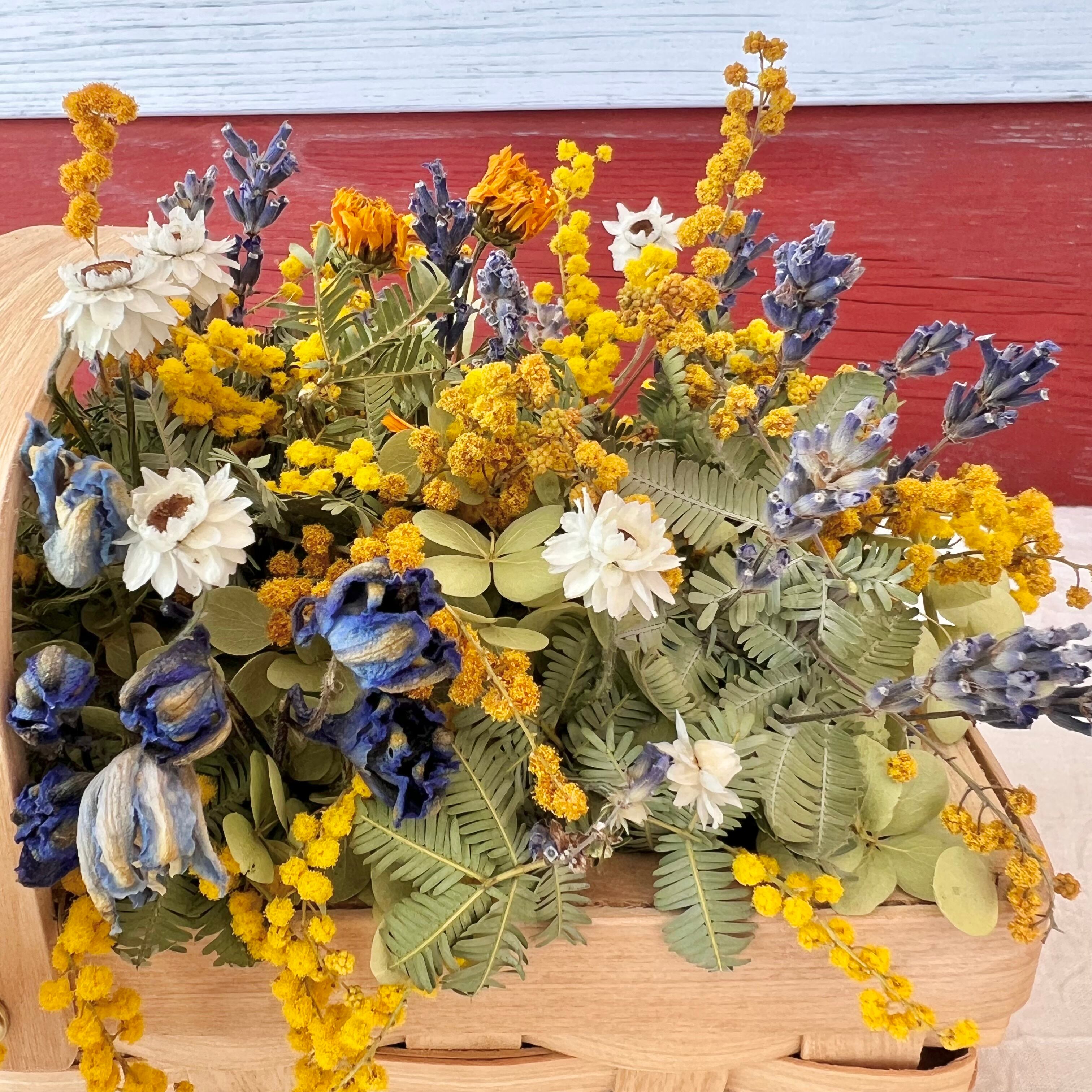 ほかに使っているドライフラワーは、ラベンダー、アンモビューム、姫ヒマワリ、マウンテンミント、ミナヅキ、ラークスパーなど
